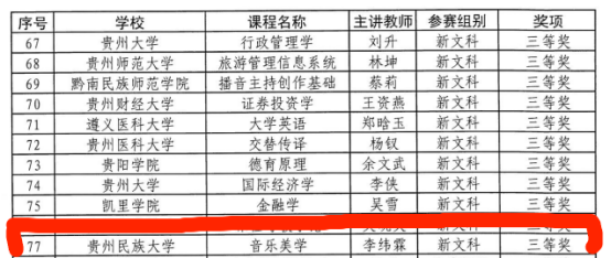 根据中国高等教育学会《关于举办第三届全国高校教师教学创新大赛的通知》(高学会[2022]104号)和《贵州省教育厅办公室关于举办贵州省第三届高校教师教学创新大赛的通知》的要求,第三届贵州省高校教师教学创新大赛于2023321日—29日完成了网络评审。根据网络评审成绩排名,全省共计26名“新文科”组别入围现场评审阶段(即现场赛)。公司李纬霖老师(团队)作为全省唯一一门“音乐类”课程进入现场评审阶段。在激烈的竞争,李纬霖老师(团队)表现出色,最终获得了“新文科”组别三等奖的良好成绩。